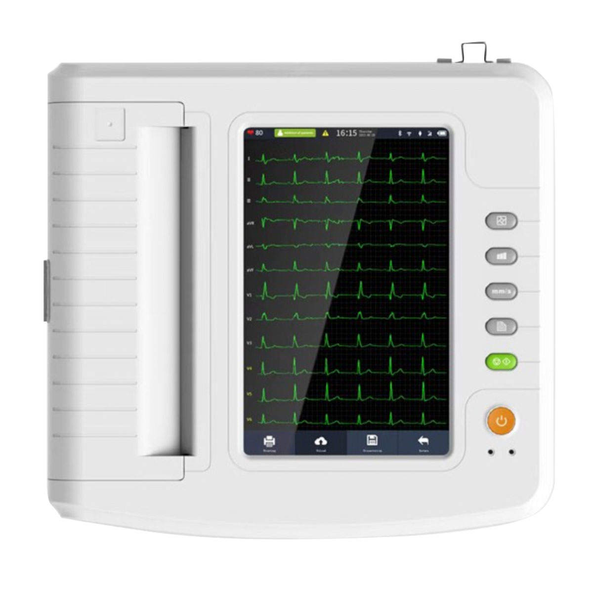 The device is an electrocardiograph which can collect 12-lead ECG signal simultaneously and print ECG waveform with thermal printing system. It features in, recording and displaying ECG waveform in auto/manual mode, measuring, analyzing and diagnosing ECG waveform parameters automatically, prompting for “Lead off” and “Lack of paper”, English menu, built-in lithium battery, AC/DC, selecting rhythm lead freely to observe abnormal heart rhythm, case database management.