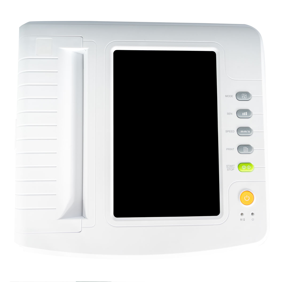 - Display 3/6/12-lead ECG waveform, HR value, print mode, sensitivity, paper speed, filter state, clock, battery power, backgroundgrid, measured parameter and interpretation, etc. on one screen, and with prompt functions for lead-off, overload and system working state.