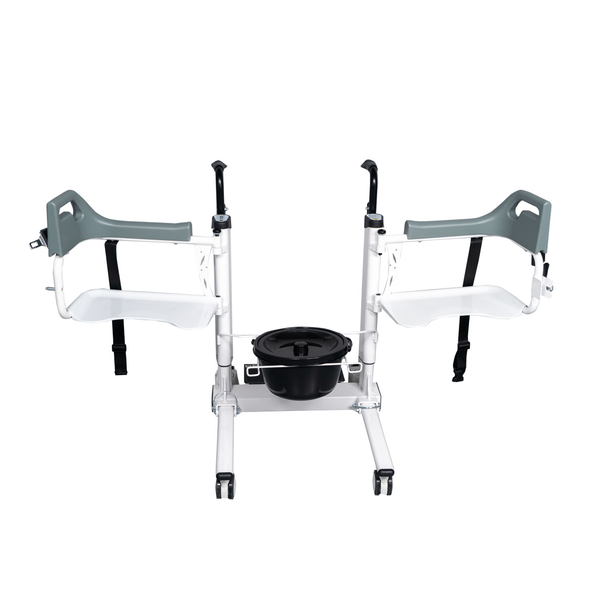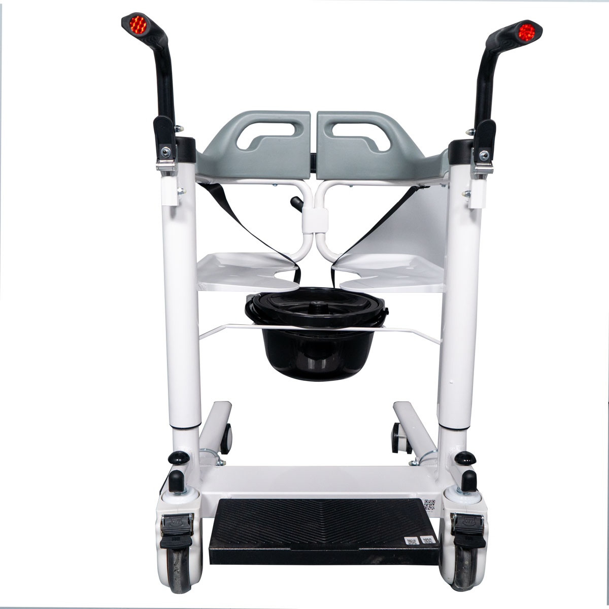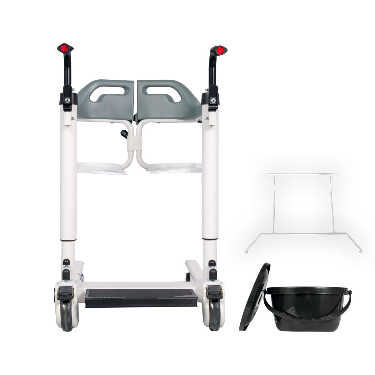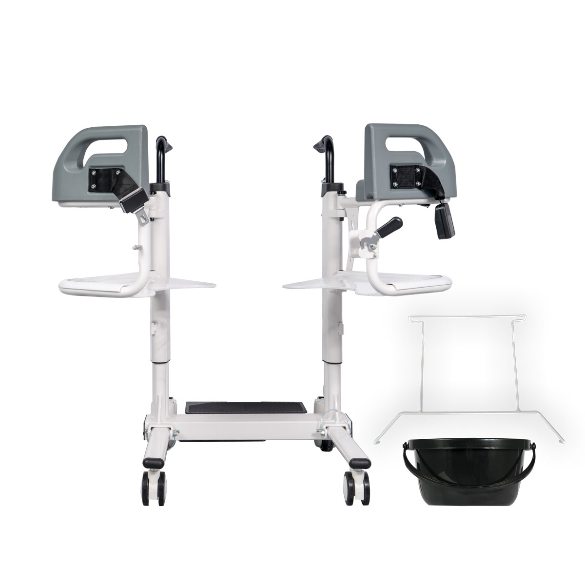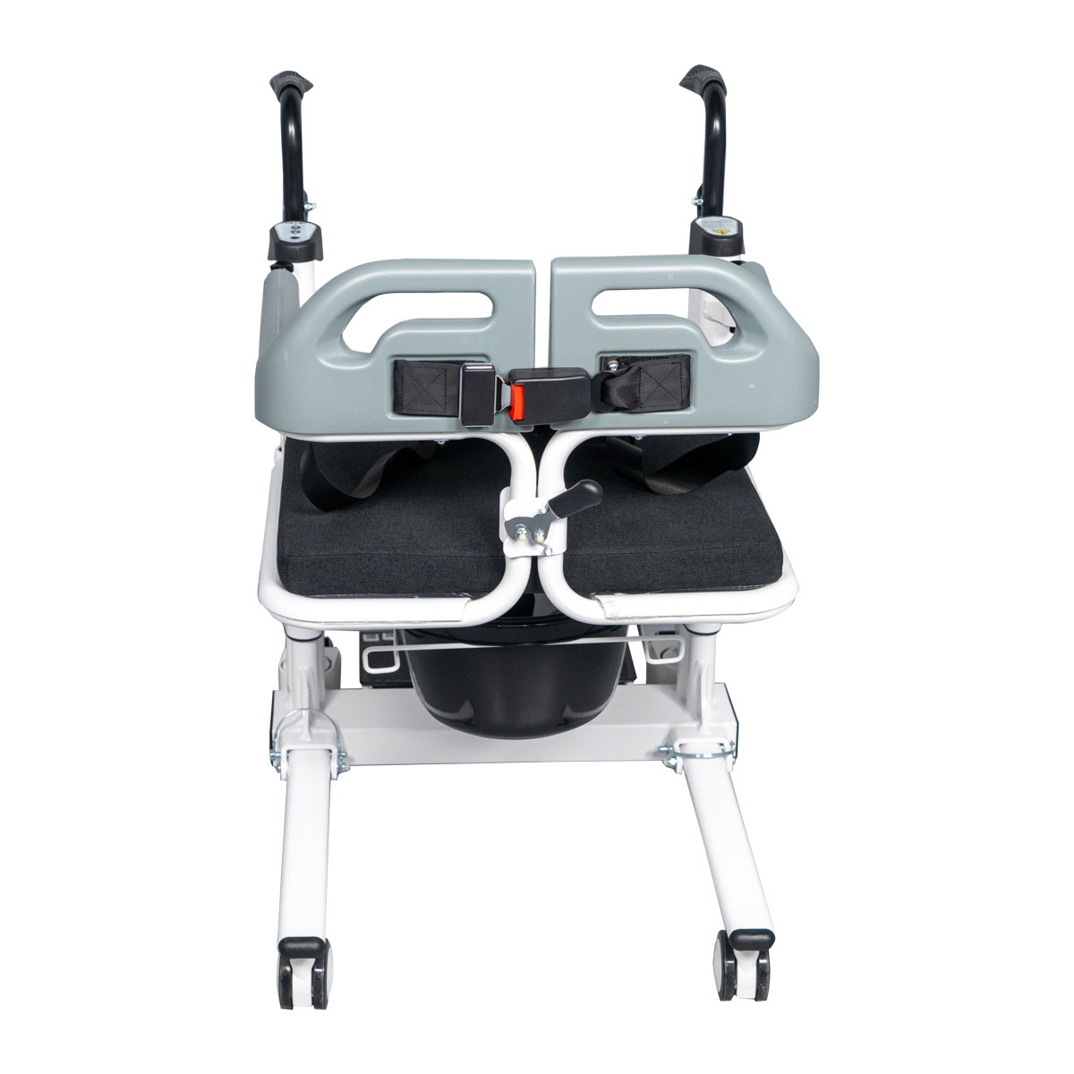 The ESTIA III wheeled lift chair can be used to transport patients within the home, to and from their bed/chair, and/or as a commode chair thanks to its built-in bucket. It has a removable fabric seat cushion for added comfort. The seat base is electrically raised using a remote control.