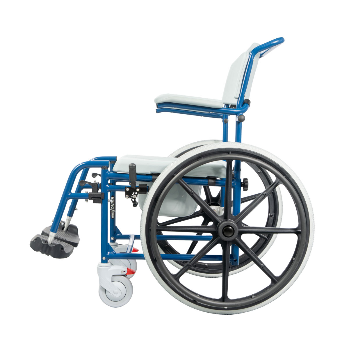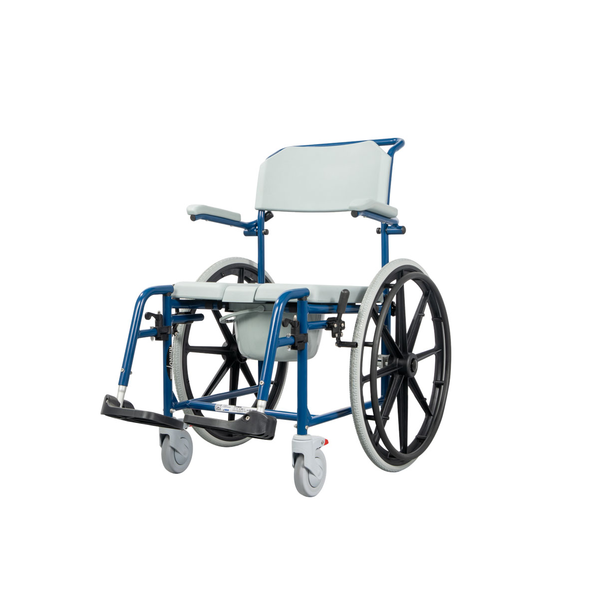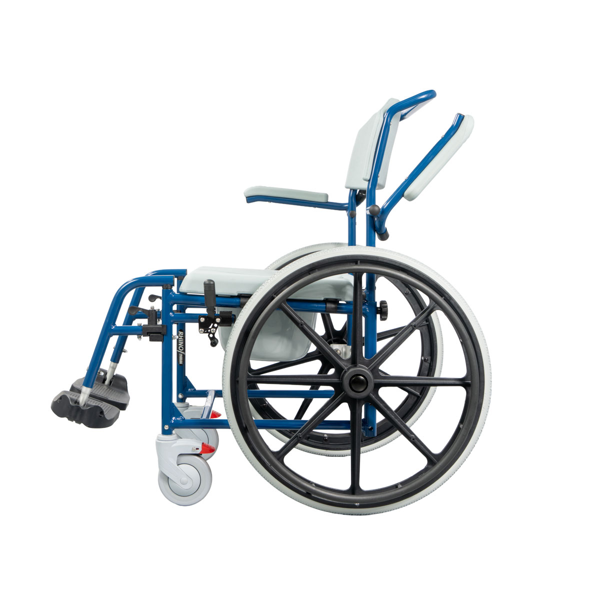 The “RHINO” wheelchairs of this type are designed to transport people, facilitating daily care and hygiene. They are ideal for use indoors, allowing the patient to be moved to the toilet or bathroom, either independently or with the help of an attendant. They also function as a toilet seat and are suitable for use in the shower, offering safety, comfort, and convenience for the user's personal hygiene.