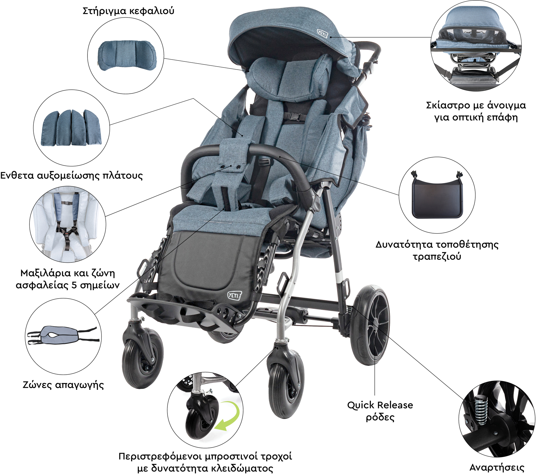 Το παιδικό αναπηρικό αμαξίδιο YETI έχει σχεδιαστεί για μεγαλύτερα παιδιά με κινητικά ή ορθοστατικά προβλήματα. Πλούσιο σε αξεσουάρ για την ευκολία του συνοδού και προσφέρει σωστή θέση
